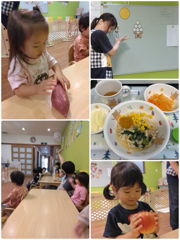 保育園では、お月見のマグネットシアターをみんなで楽しみました。マグネットシアターの中にも出てきたりんご🍎とさつまいも🍠を実際に触ったり、匂いを嗅いでみたり!給食では、まんまるお月様が浮かんでいるお月見うどんをみんなで美味しくいただきました。