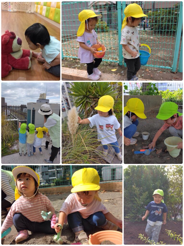 いつまで夏の暑さが続くのだろうと思っていましたが、ようやく少しずつ秋らしい気候になり、公園へお散歩に行ける日も増えてきました。久しぶりの公園では、虫探しやしゃぼん玉、砂遊びやお店やさんごっこを大喜びで楽しんでいました。