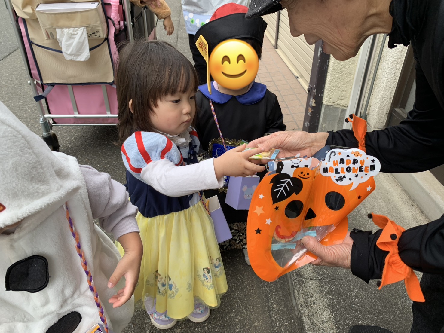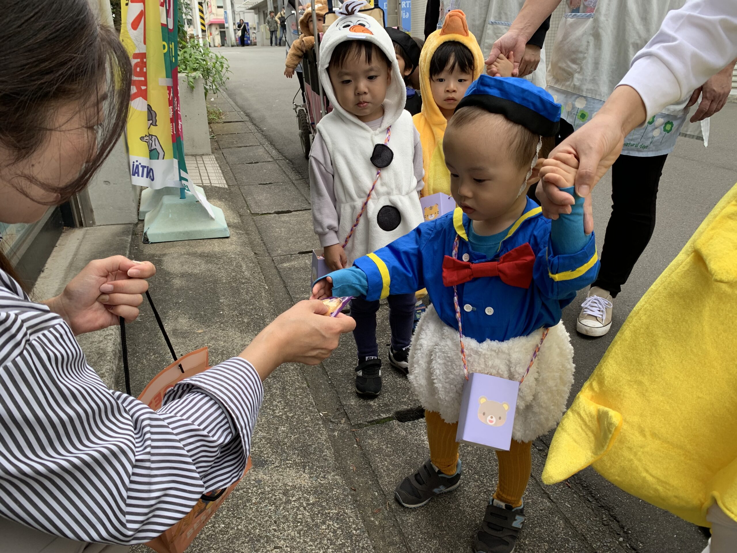 集合写真を撮った後は、近くのお店にお菓子をもらいに出発!!