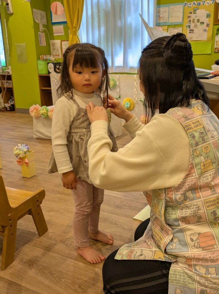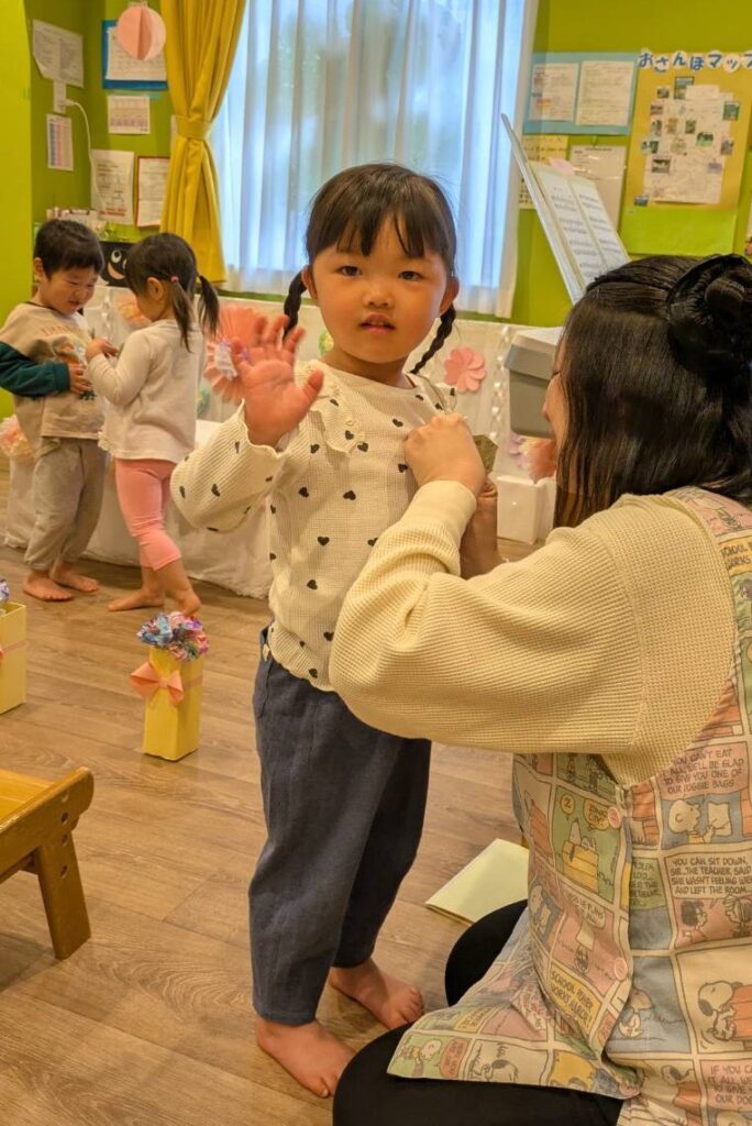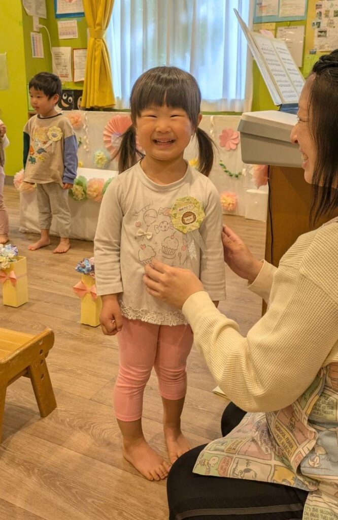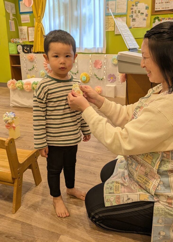 素敵なコサージュを胸につけてもらい、嬉しそうな卒園児のお友だち✨