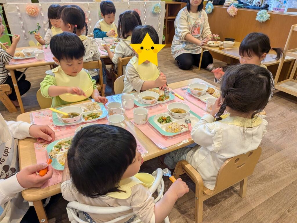 お花の可愛い飾りつけの特別な雰囲気の中、桜のランチョンマットを敷いてお給食をたべましたよ〜!