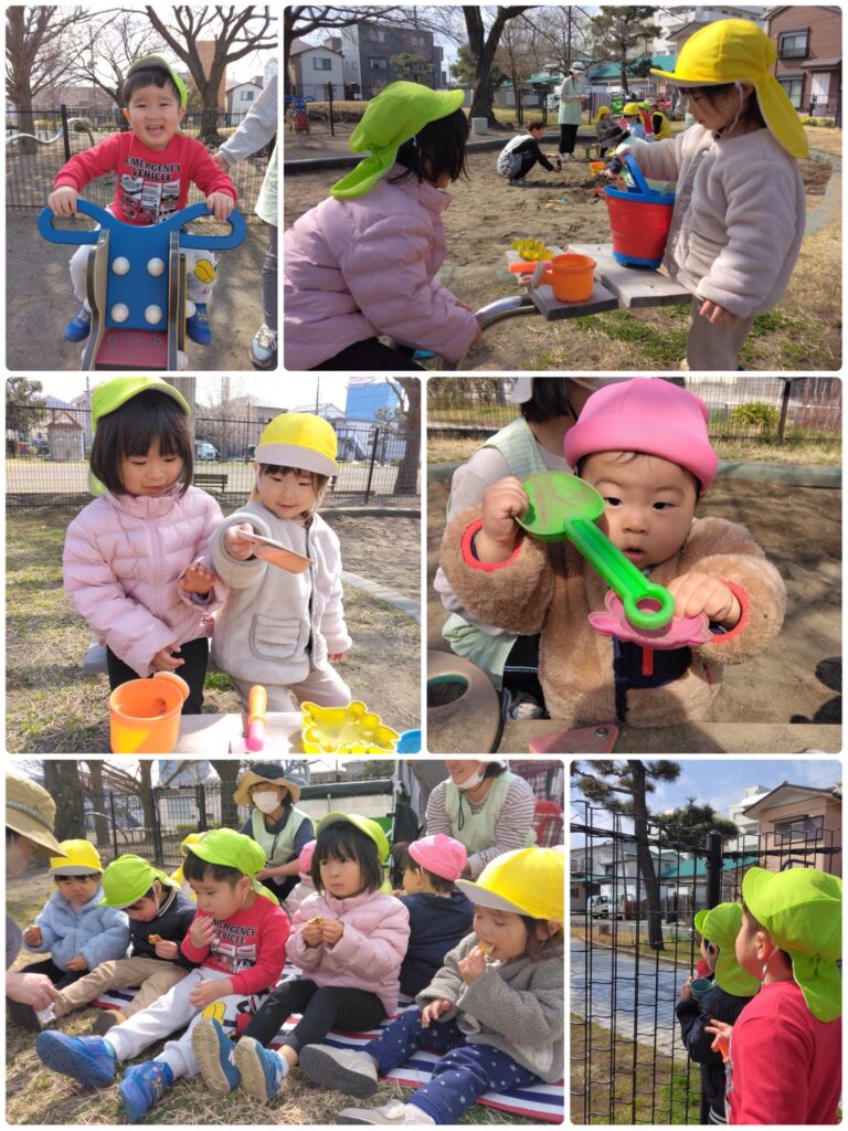 みんなが大好きな砂遊び!アイス作りも、とっても上手になりました。「いっしょにあそぼう!」「これ、かして」というやりとりも、自然と見られるようになり日々成長を感じることが出来ました。明日からは新年度スタート!!進級、卒園しても、みんなの笑顔をずっと応援しています!